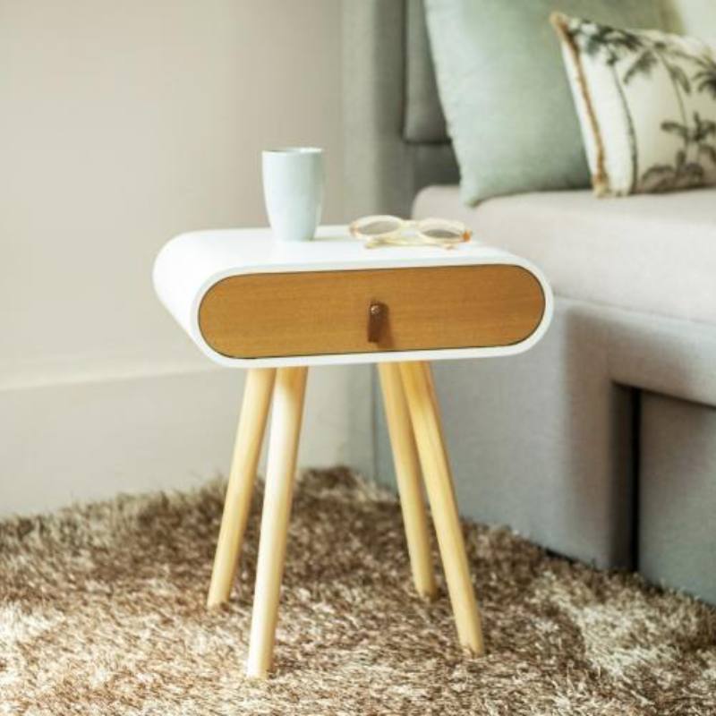 طاولة تخت جانبية بيضاوية خشب مع درج بتصميم غير تقليدي، بشكل بيضاوي أنيق مناسبة لغرف النوم والمعيشة .