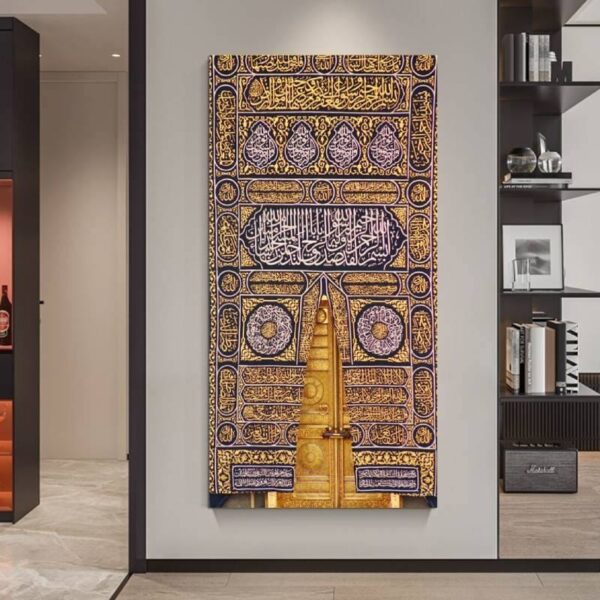 لوحة باب الكعبة اسلامية تقليدية مضيئة , جدارية عمودية بحجم كبير فن اسلامي مزخرفة بالخط العربي مناسبة لديكور المنزل او المكتب .