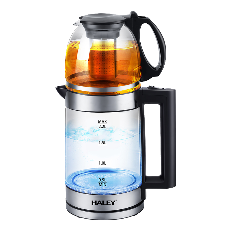 غلاية كهربائية زجاجية متينة بسعة 2.2 لتر من هالي تتميز بتصميم مزدوج الطبقات ، مصنوعة من الزجاج عالي الجودة والفولاذ المقاوم للصدأ، مما يضمن المتانة والأناقة .