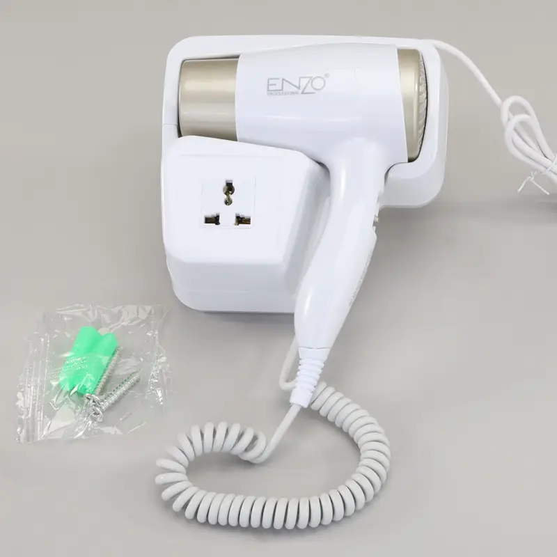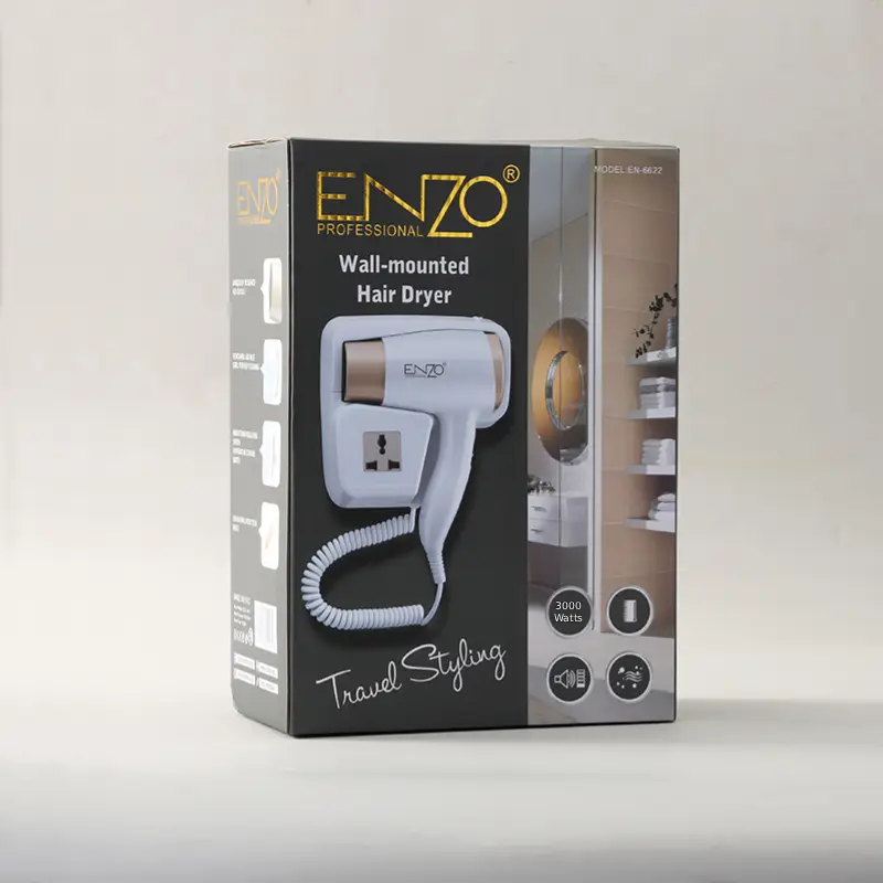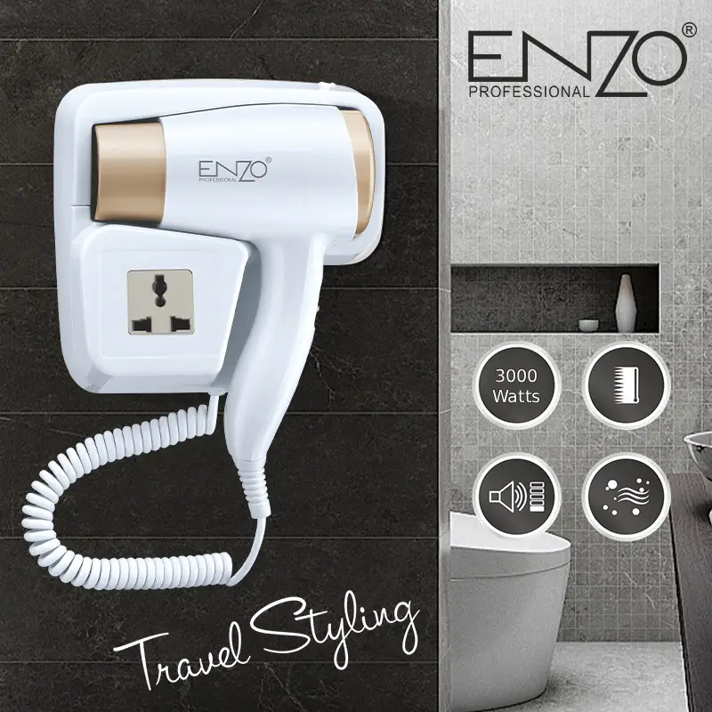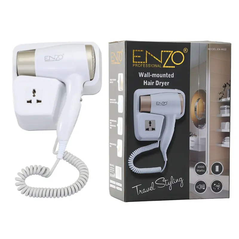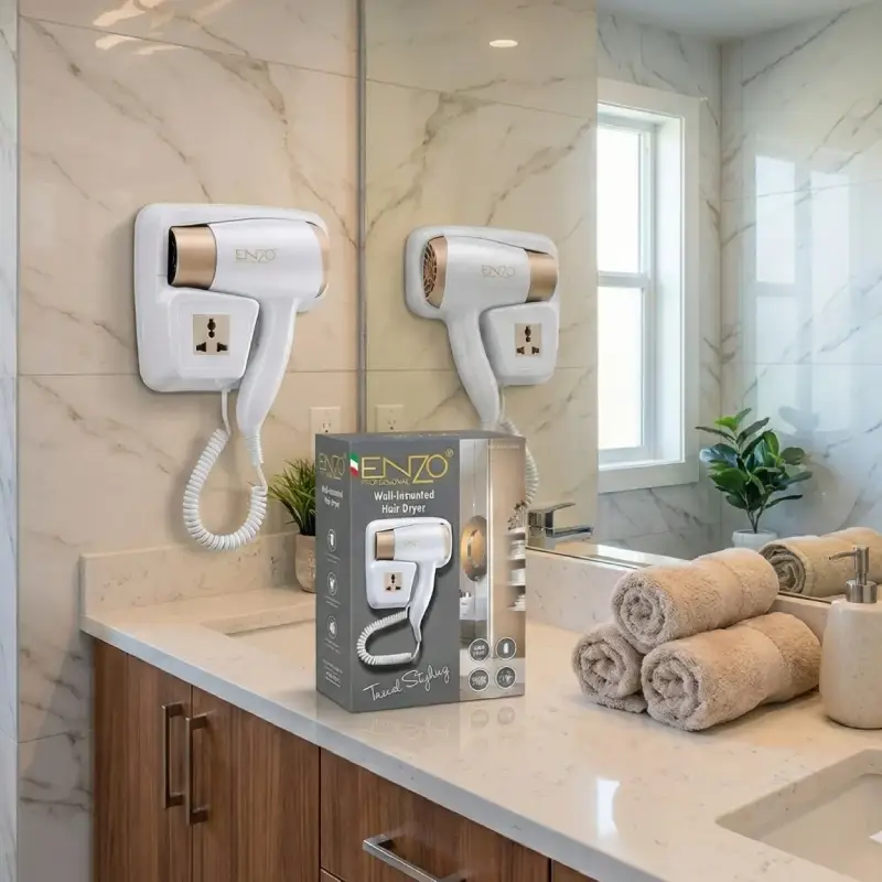مجفف شعر “إنزو” الاحترافي موديل EN-8622 مع تصميم عصري يثبّت بسهولة على الجدار ليحافظ على مساحة نظيفة ومنظمة مثالي للفنادق والحمامات المنزلية