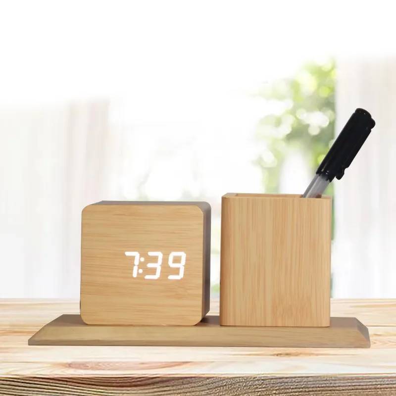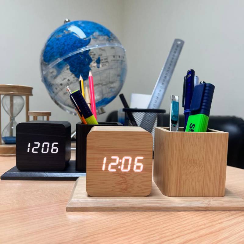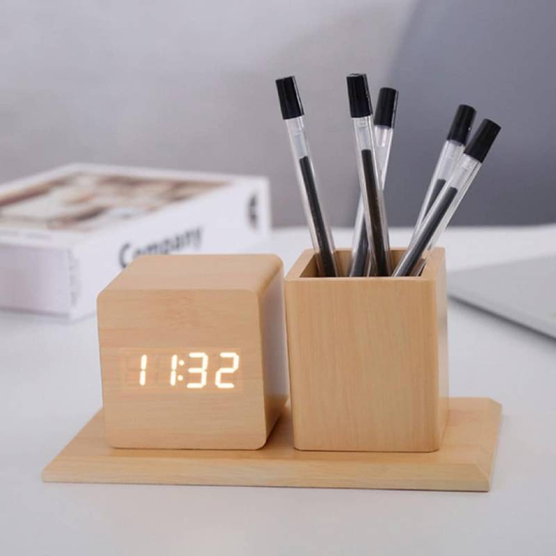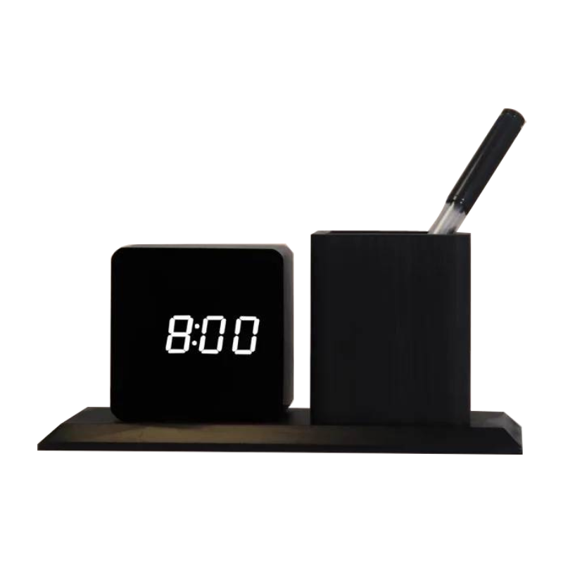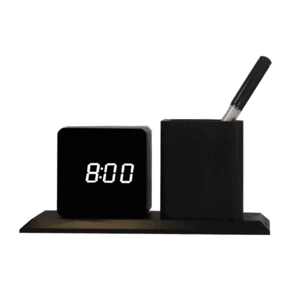 ساعة مكتب فورمايكا رقمية مدمج بحامل اقلام تتميز بالحجم الصغير و الشكل المكعب متعددة الوظائف مناسبة للمكاتب و غرف النوم و المعيشة .