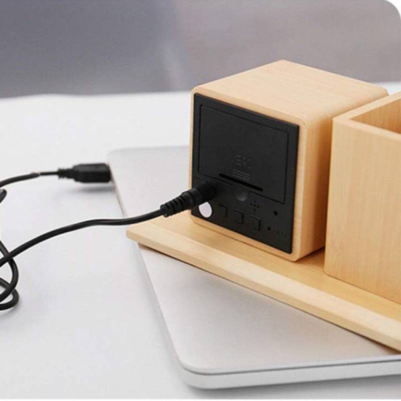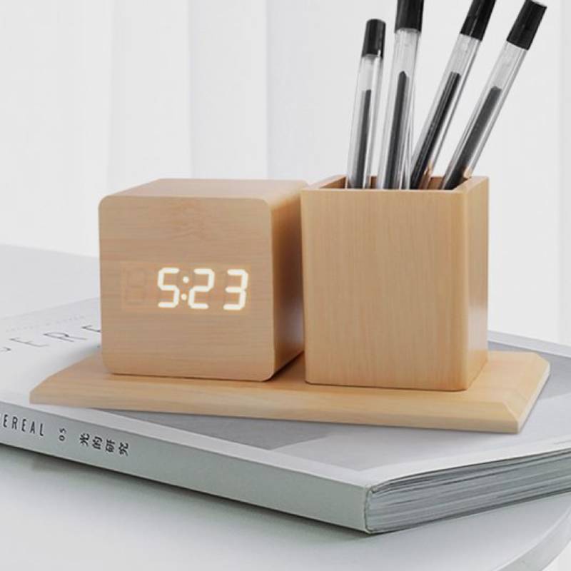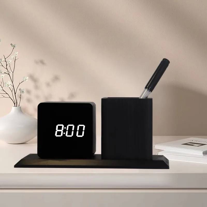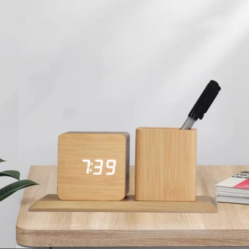 ساعة مكتب رقمية + حامل اقلام تتميز ساعة المنبّه الرقمية هذه بالحجم الصغير والشكل المكعب و المواد النسيجية الخشبية القابلة لإعادة التدوير والمظهر الأنيق