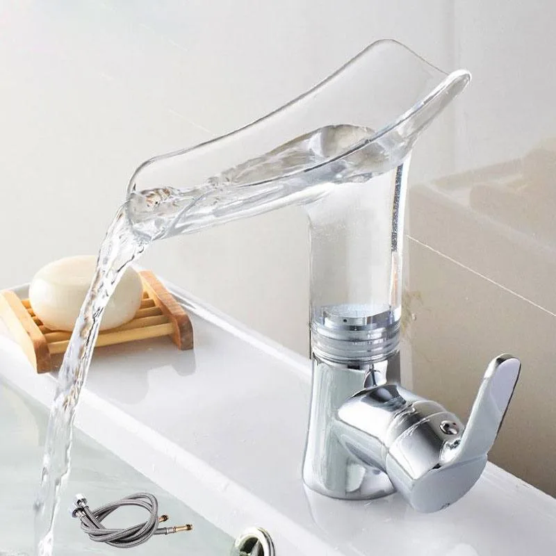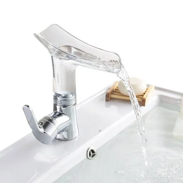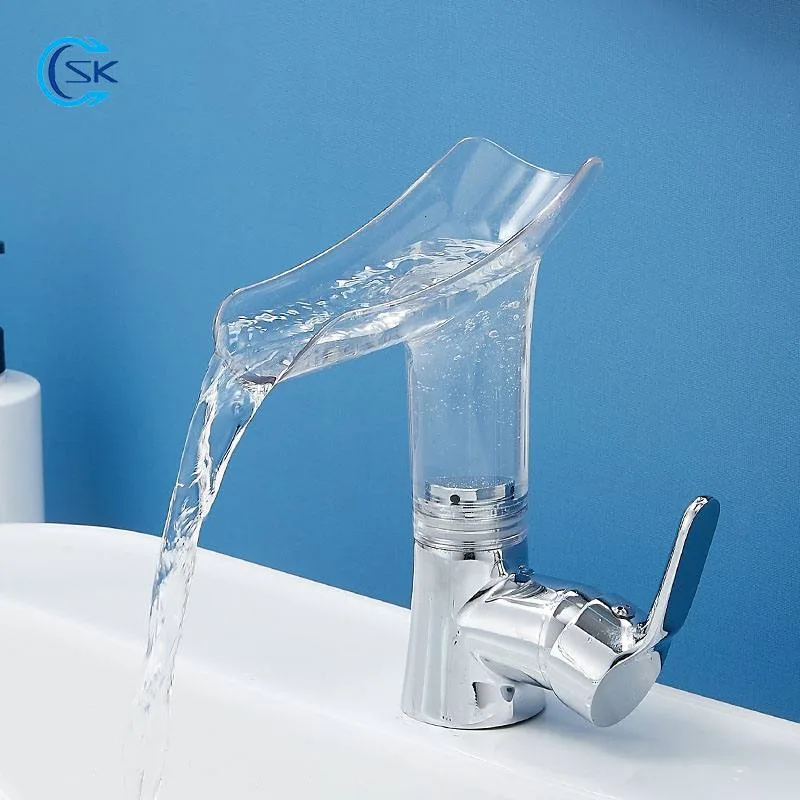 أحدث تصميم جمالي لــ حنفية زجاجية على شكل شلال شفافة اكرليك بمقبض واحد بـ دوران 360 درجة مناسبة للاستخدام في الحمام أو حنفية حوض المطبخ .