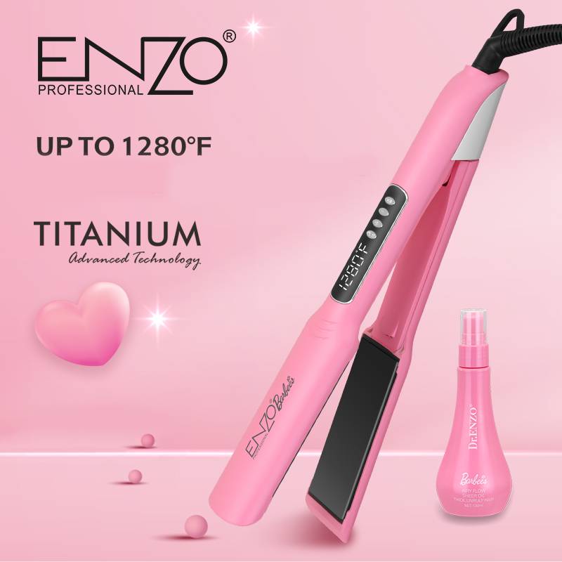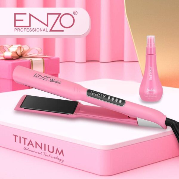 مملس انزو باربي مع سيروم كيراتين للحصول على نعومة ولمعان مثل صالونات التجميل , مكواة احترافية بقوة 55 واط متطورة لتصفيف وتمليس الشعر ، مزوّدة بألواح من السيراميك بتقنية النانو تيتانيوم .