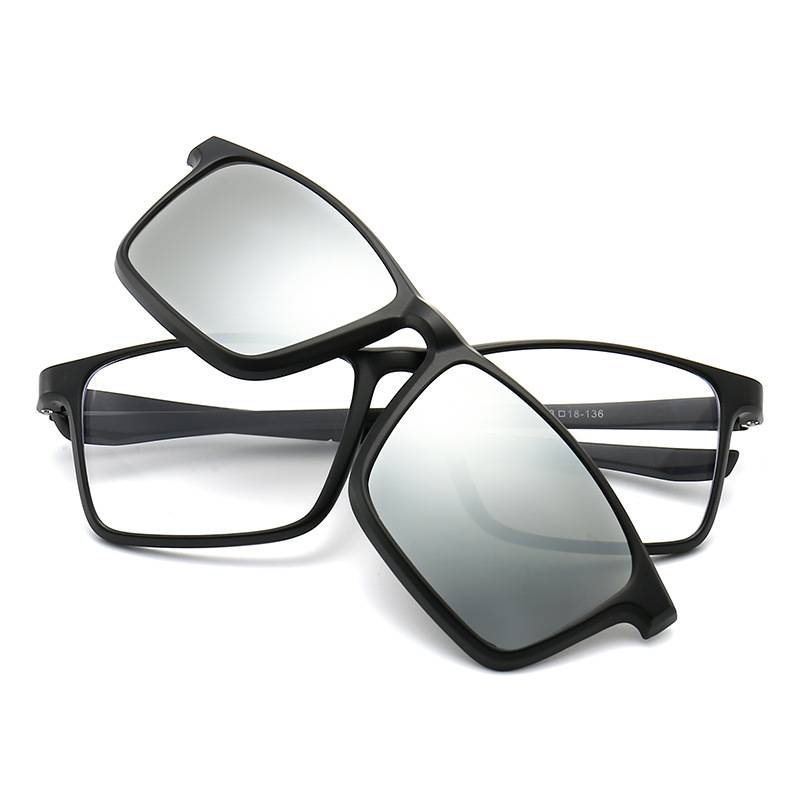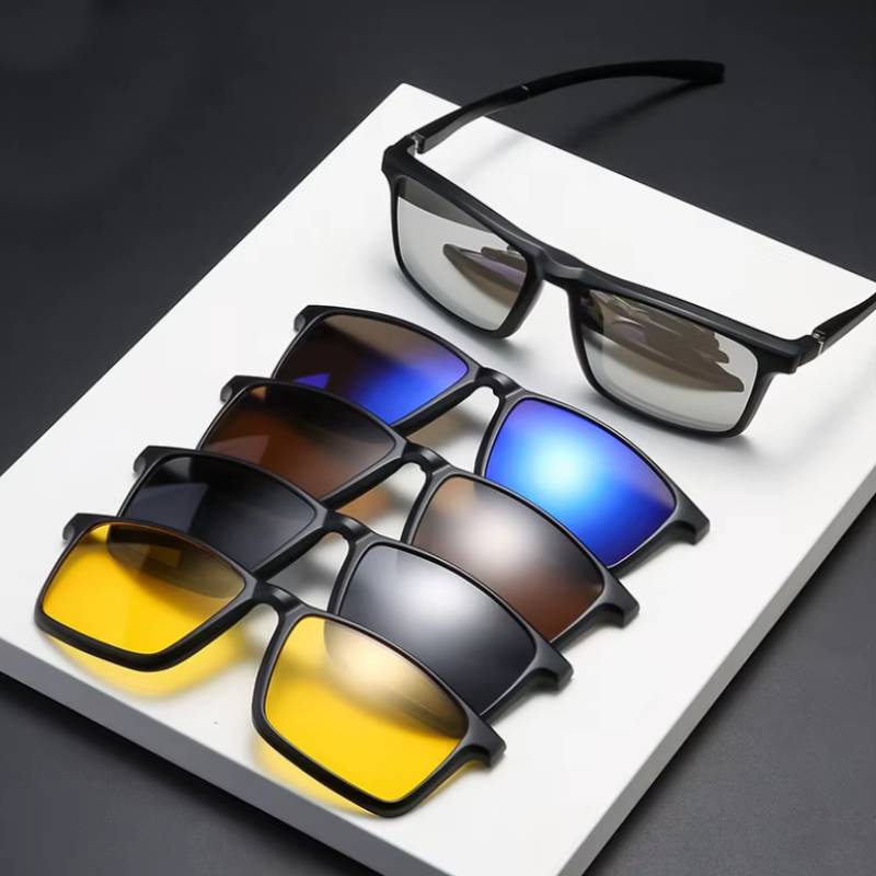 نظارات شمسية مغناطيسية 5 في 1 تحتوي على 5 الوان مختلفة : ( الازرق , الاسود , البني , اصفر , سكني , شفاف ) .
