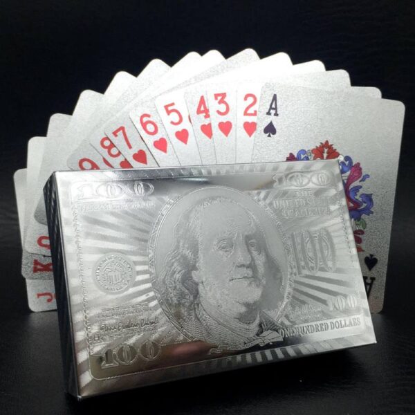 ورق الشدة بوكر كازينو المطلي بـ الفضي يتميز بتصميم شبيه لـ عملة الدولار الامريكي .