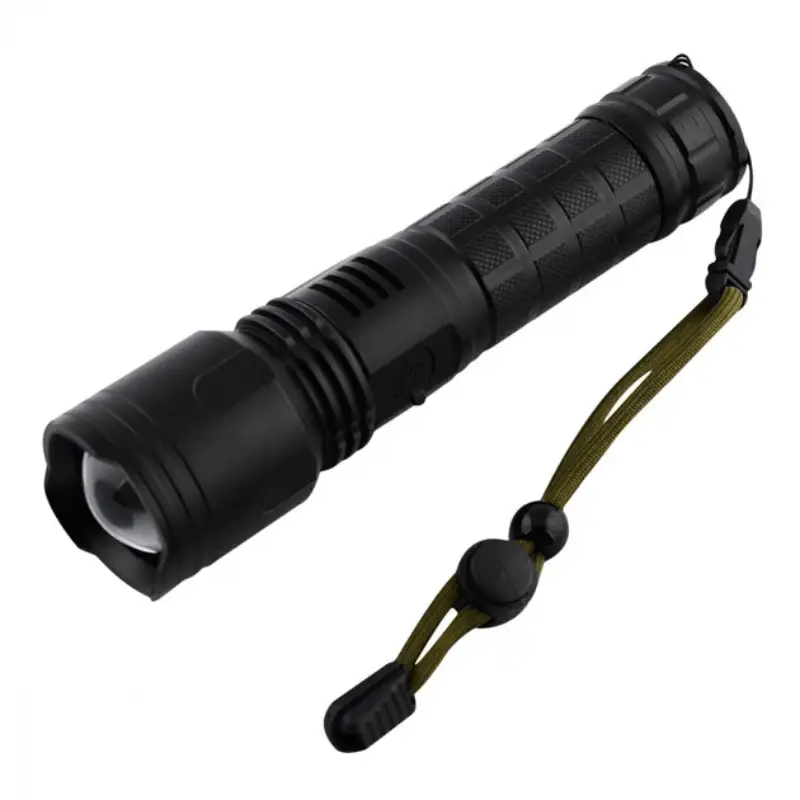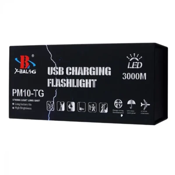 مصباح يدوي تكتيكي قابل لإعادة الشحن عبر USB يستخدم صمام ثنائي باعث للضوء (LED) قوي يوفر إضاءة مشرقة وله مدى إضاءة طويل يصل إلى 3000 متر .