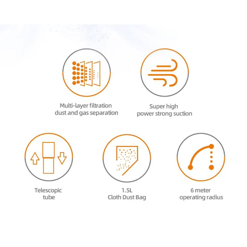 بربيش مرن لسهولة الحركة *  نظام فلتر متعدد المراحل * سعة كبيرة : تتميز بوعاء أتربة كبير لجمع الغبار، مما يقلل من الحاجة لتفريغه بشكل متكرر , نظام فلترة